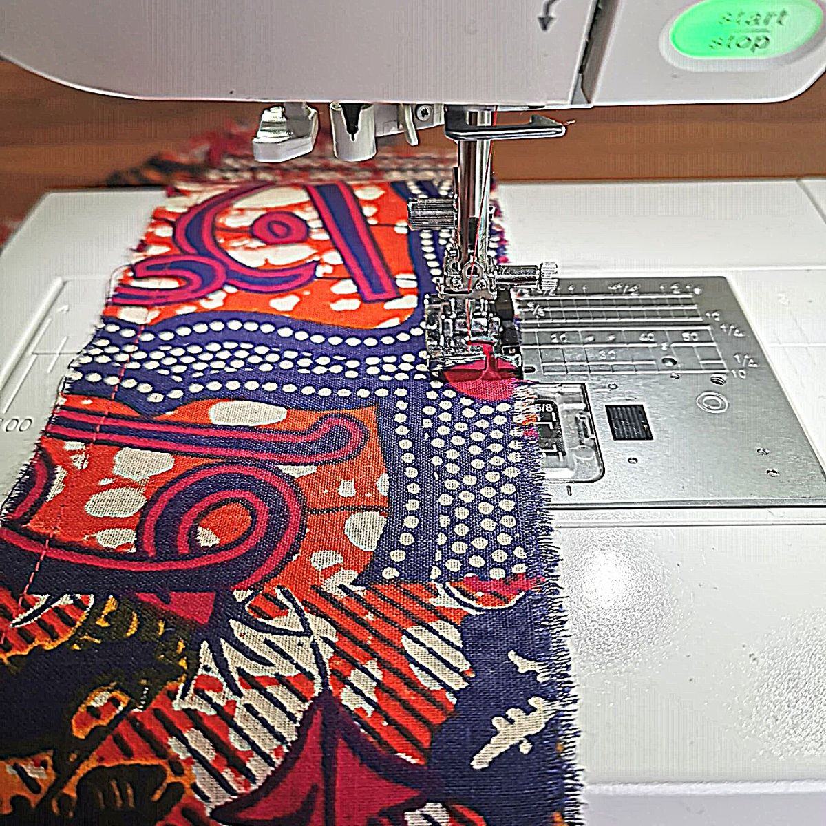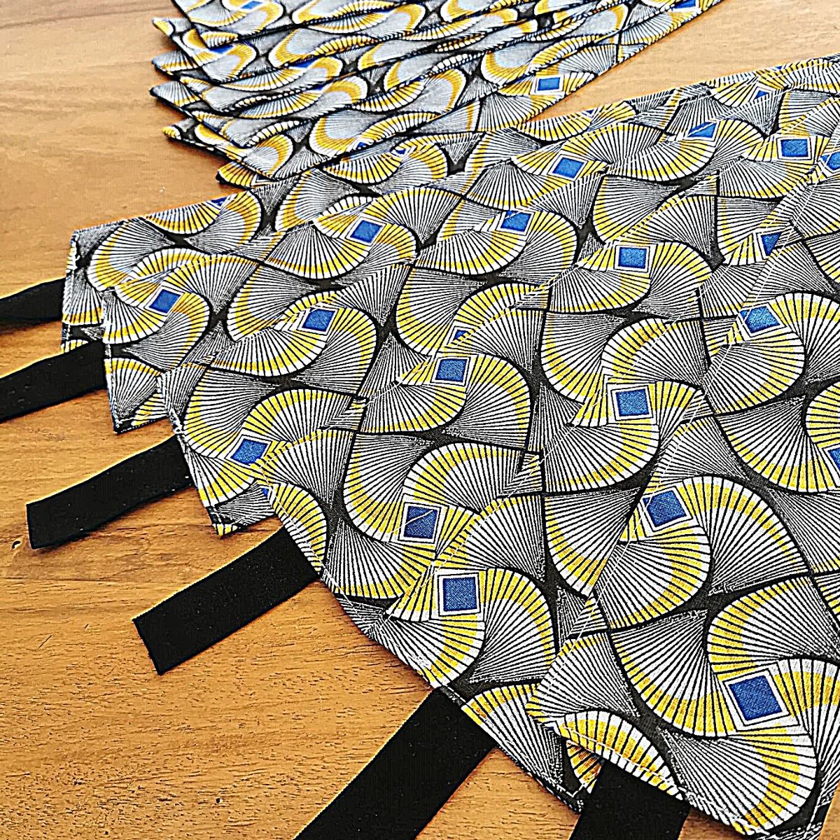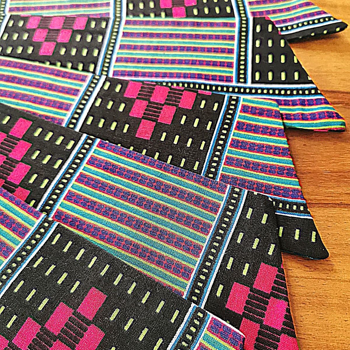 Nous avons pensé « L’été en Wax » de Colette et Lucie comme une parure pleine de couleurs et de bonne humeur, avec cette petite touche chic et bohème que l’on aime tant. Nous avons sélectionné ensemble 3 tissus qui ont été les bases de notre inspiration : Un bleu et noir très graphique, illuminé par quelques touches de jaune, puis un rouge profond dont le motif nous à tout de suite séduites. Notre dernier choix est frais et féminin à dominante rose et vert, un petit air de vichy destructuré.